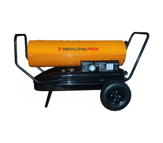 Металлический корпус тепловых пушек Neoclima Prof выполнен из теплоизолированного материала с износостойким покрытием. Он надежно защищает внутренне устройство прибора. Работают они прямого нагрева за счет сжигания топлива. Из встроенного топливного бака топливо поступает в фильтр, который для большей эффективности подогревается. Происходит очистка топлива от вредных примесей и грязи. С помощью компрессора (насоса), топливо подается на форсунку, распыляется, и попадает в камеру сгорания. Одновременно, в камеру сгорания поступает нагнетаемый вентилятором воздух. Они смешиваются, и полученная смесь воспламеняется с помощью свечи зажигания. Экран, расположенный в камере сгорания дизельного калорифера, препятствует выбросу пламени. Для безопасности и долговечности эксплуатации камера сгорания выполнена из нержавеющей стали. На выходе теплый воздух перемешивается с продуктами сгорания и поступает в обогреваемое помещение.